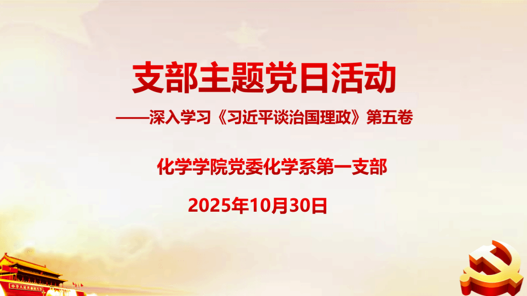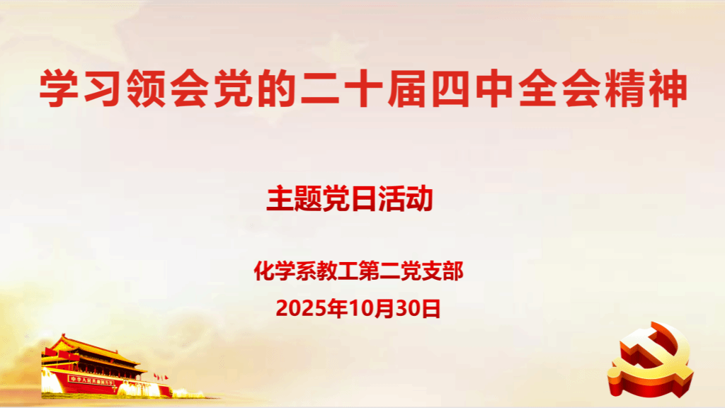 (通讯员:丁聪)10 月 30 日下午,化学系教工第一党支部在化学楼 A106 会议室开展主题党日活动,支部党员教师参加学习活动,活动由支部书记曹敏惠主持。支部宣传委员丁聪领学了《习近平谈治国理政》第五卷中关于中国式现代化的重要论述。她谈到,中国式现代化是强国建设、民族复兴的康庄大道,其中阐述的顶层设计与实践探索、守正与创新等六大辩证关系,为化学学科对接国家战略提供了根本遵循,更是当前教学和科研工作的重要行动指南。...