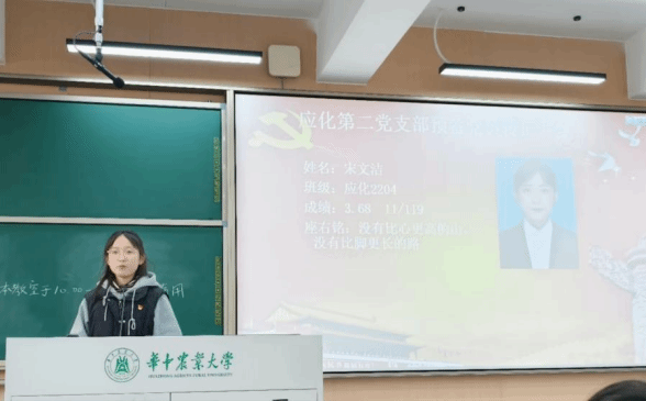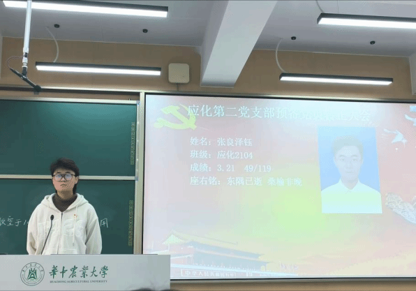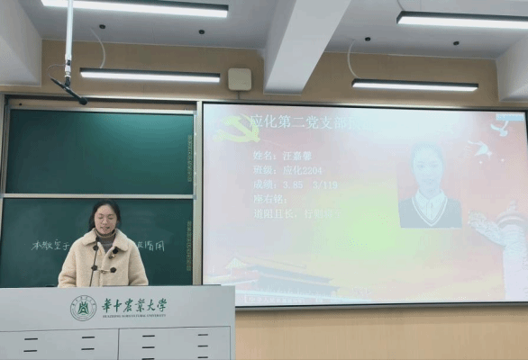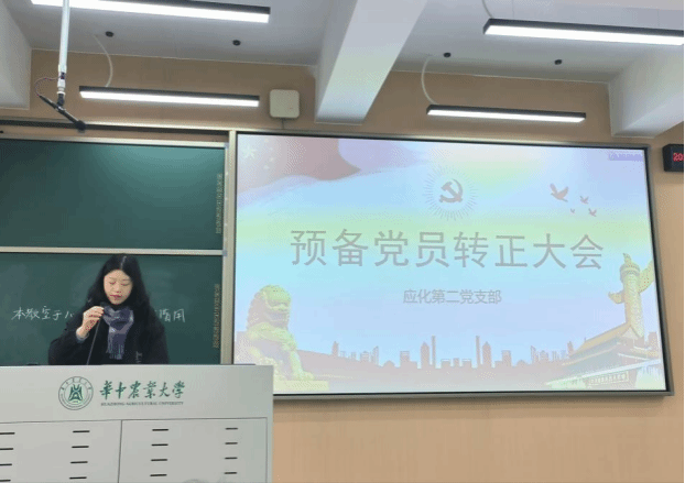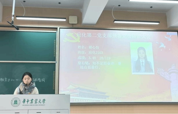 应化本科生第二党支部在二教103举行预备党员转正大会,讨论汪嘉馨等4名同志按期转正问题,党支部书记柳晓珊老师、支部全体党员同志共同参会。