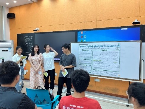 本次全英文课程通过课堂讲授、分组研讨和课后拓展阅读相结合的形式,让学生“沉浸式”参与全过程学习。以科学问题为导向进行小组即时阅读和研讨,带领大家共同探讨生命现象背后的化学本质,提升学生对化学与生命科学学科交叉领域研究的逻辑思维能力和研究方法。最终的结课考核环节更是要求各小组同学通过对不同专题的理解和创新衍生出新的主题,并采用海报口头展示的方式进行汇报。在老师的指导下,从主题的拟定到框架构建以及内容确定和全英文海报的制作和呈现,每个小组都废寝忘食。经过3个多小时激烈地汇报讨论,外教和助教老师们从主题原创性、海报结构、设计感,口头表达和团队协作等方面对大家的汇报进行评估,评出了最佳海报。