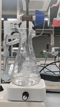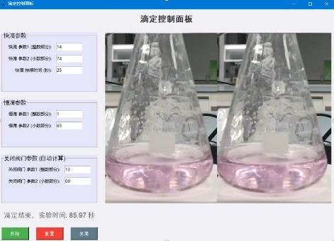 我校代表队选取的滴定实验为高锰酸钾测定硫酸亚铁铵中亚铁离子含量,为比赛中唯一一项氧化还原滴定反应。与其余队伍所设计的实验截然不同的是,该实验采用有色标准溶液滴定无色待测溶液。在有色标准溶液在滴入锥形瓶的扩散过程中易造成颜色误判,具有一定的挑战性。我校代表队直面挑战,多次改进实验方案,修改程序代码。最终成功解决了扩散时残留颜色问题,同时突破性地解决了背景颜色对滴定终点颜色识别的干扰,并自主设计滴定控制面板,大大降低了对于滴定速度控制的难度。并基于该面板优秀的速度调节功能,采用快慢滴结合的方式,在提高了滴定效率的同时保证了滴定的准确度。