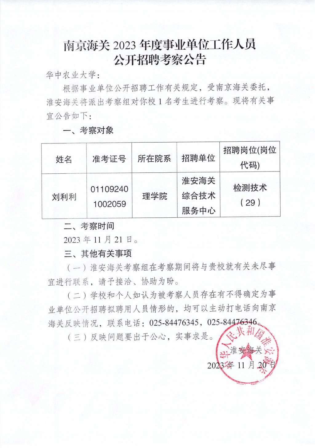 南京海关2023年度事业单位工作人员公开招聘考察公告