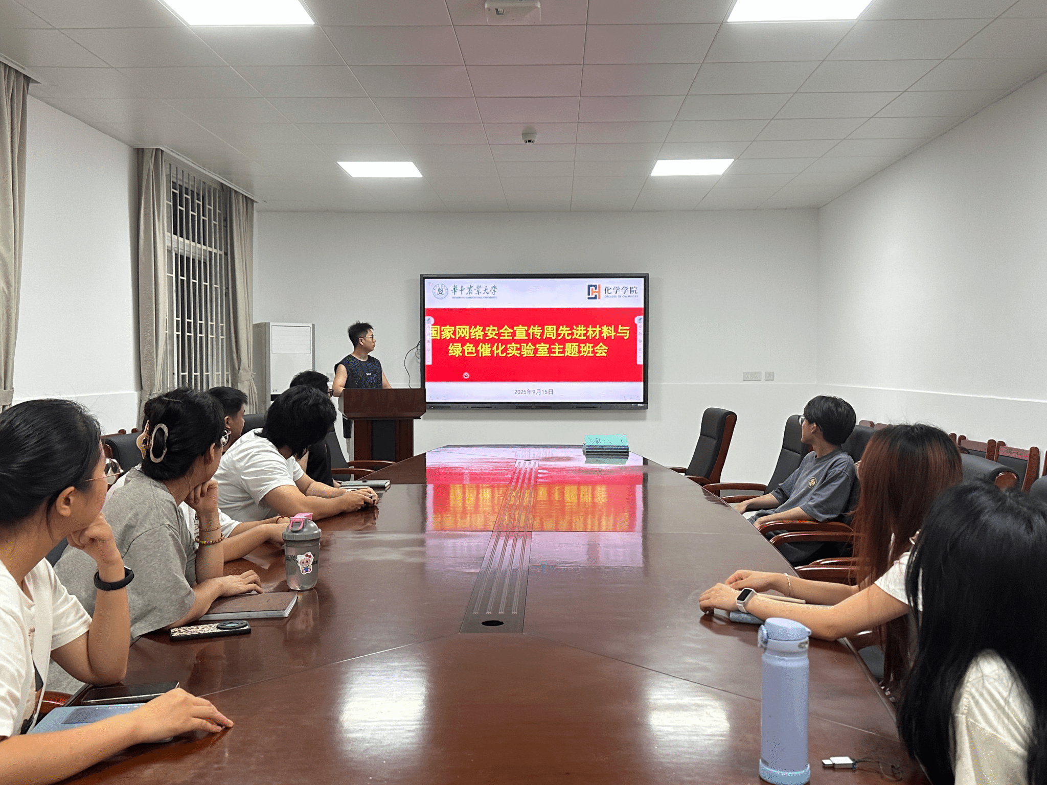 先进材料与催化实验室于 2025 年 9 月 15 日在化学楼 A106 召开 “树立正确的网络安全观” 主题班会,实验室全体研究生参与此次活动。