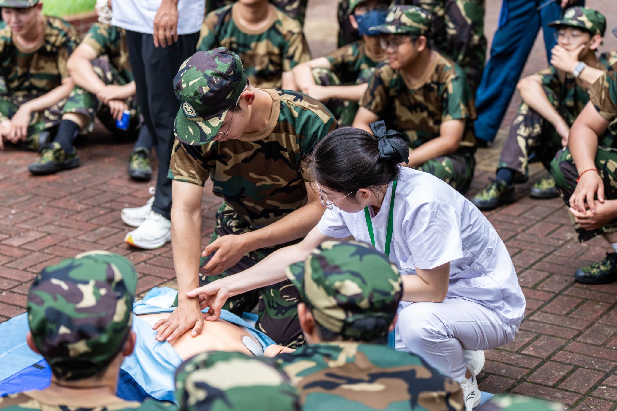 实用技能学习同样是军训的重要一环。从基础急救到战地救护,同学们围在假人旁专注听讲、认真实操。校医院医生们细心指导,及时纠正操作细节。止血包扎、海姆立克法……每一项技能都关乎生命,每一次演练都意义非凡。这不仅是一堂急救课,更是一堂深刻的生命教育课,让同学们在掌握技能的同时,建立起对生命的敬畏。