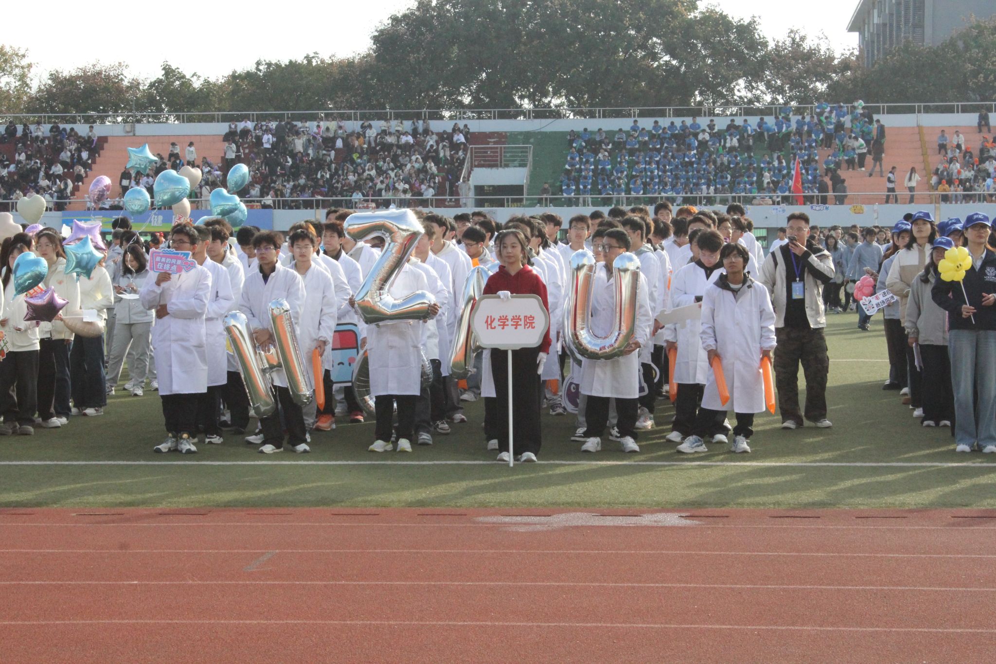 随后的创意方阵环节,化院队伍更是成为运动场上的“焦点风景线”。伴随着欢快激昂的进行曲,方阵最前方的化院教职工与学生代表率先“破圈”:他们共同高举造型为化学符号的彩色道具,在阳光下熠熠生辉,一举点燃全场热情。后方师生则以“方阵为笔、步伐为墨”,迈着活力满满的步子踏过主席台,化院队伍宛如一串流动的“奋进方程式”,每一步都书写着“团结向上、敢闯敢拼”的化院精神,引得现场掌声与欢呼声交织。