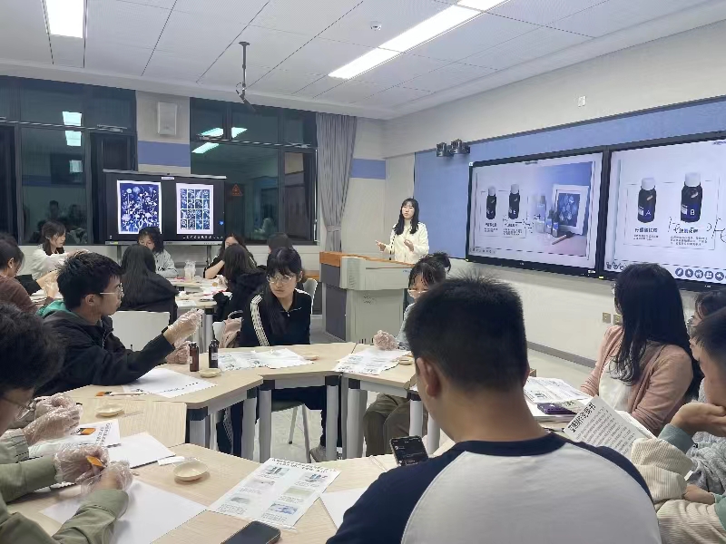 “大家知道什么是蓝晒吗?”“光和普鲁蓝之间存在什么样的关系?”活动现场,田雨饶有兴致地向同学们介绍了蓝晒的原理、由来和工艺应用,她谈到,蓝晒是一种传统而又独特的成像工艺,主要是利用紫外线作为催化剂,氧化柠檬酸铁铵和铁氰化钾的混合溶液中的二价铁离子产生普鲁蓝,从而实现曝光成像,成品与中国传统手工艺蓝染有着相似的面貌。田雨向同学们展示了“蓝晒”与“蓝染”的不同技艺和制作过程,并指出,“蓝晒”与“蓝染”一个是有百年历史的成像工艺,一个是历经千年的染色技术,二者巧妙地呈现出相似的效果,跨越时空和地域,既有差异又包含着千丝万缕的联系,展现出艺术的创造力。