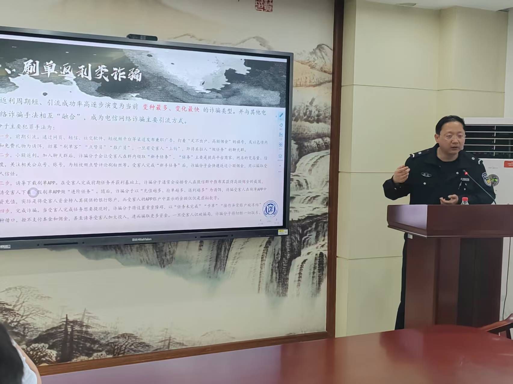 于逸夫楼 B201 报告厅,面向全体预科生开展了一场防诈安全教育专题培训。本次活动由预科一班杨圆思同学主持,特别邀请到洪山区南湖派出所经验丰富的资深警官郭峰担任主讲嘉宾,为同学们带来了一堂内容充实、干货满满的反诈宣传课。
