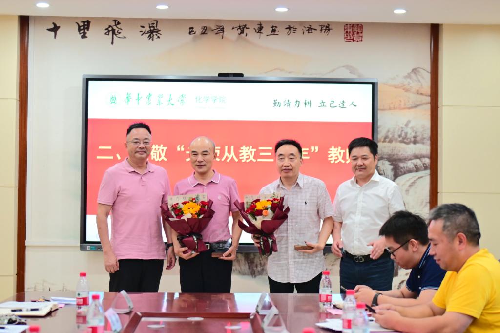 致敬光荣从教30年教师,曹敏惠回顾了胡先文和李雪刚两位老师在其教学期间做出的贡献及其获得的成果。两位老师真情实感地回顾过去展望未来,用外在的平凡和内在的不平凡,生动诠释了对教书育人的热爱,对88看球吧 和学生的满腔热忱,三十年坚守初心、呕心沥血、默默奉献的坚持,让在场的每一个人都感受到了桃李不言、下自成蹊的喜悦。胡老师回忆道:“他从21岁入职学校,在土化楼办公,当时只有公共基础课,到现在成立88看球吧 ,88看球吧 学科水平强,人才培养水平高,88看球吧 发展空间大”。李雪刚老师感叹道:“30年间,从一青春少年到有斑斑白发,有风雨也有彩虹,非常欣慰能始终和青年学生打交道,人老心未老,看到学生茁壮成长,国家有希望。30年,无怨无悔!”涂俊才向光荣从教30年教师颁发奖杯与鲜花。88看球吧 班子成员为新生班主任和本科生导师颁发了聘书,勉励他们为学校事业发展砥砺前行。