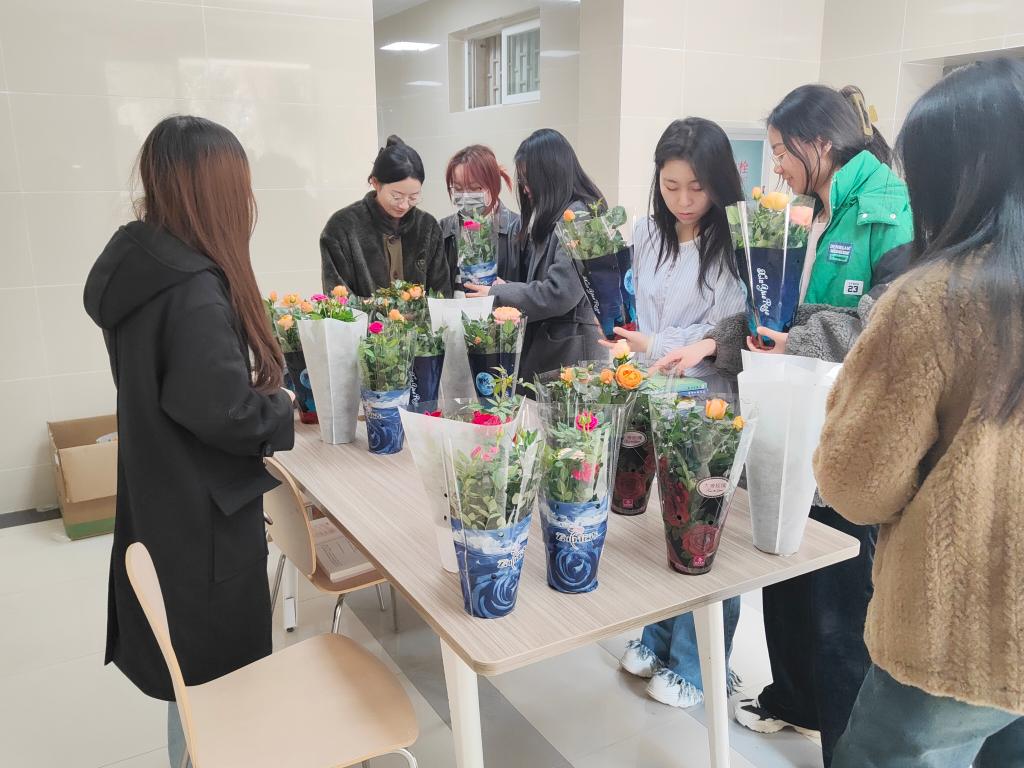 活动现场,一盆盆月季花整齐地摆放着,似乎在等待着主人的到来。女教职工、女同学通过捐赠两本符合要求的图书,从志愿者手中领取一盆精美的月季花,用“花香换书香”吸引了三十多位女教职工和同学们前来参与。短短一个小时,预先准备的45盆月季花被换购一空。