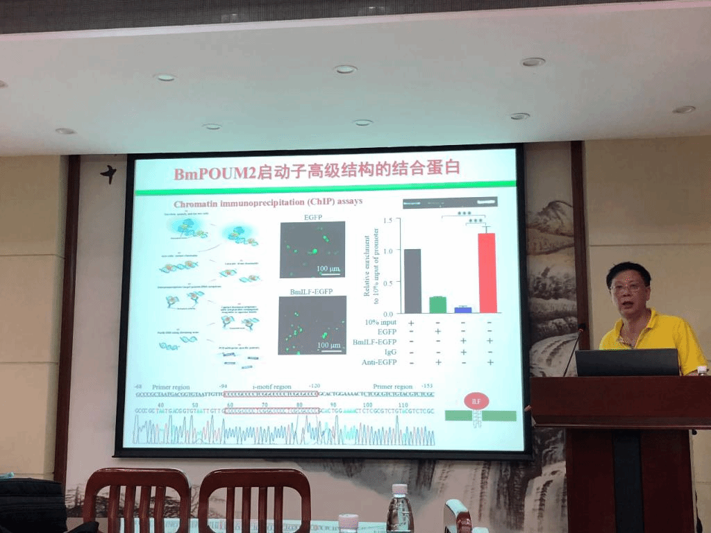 冯启理教授首先介绍了他们对家蚕翅原基变态发育机理的研究成果,讲述了关键基因BmPOUM2启动子高级结构的发现历程,进而验证上述高级结构为G-四链体和i-motif,并筛选出能够与上述结构结合的转录因子并证明其参与BmPOUM2的表达调控。冯教授谈到,基于生物信息学方法分析不同进化阶层的生物基因组中的G-四链体结构,反映出物种进化过程中G-四链体的密度及其loop区长度呈现增加的趋势。最后冯教授又提出,G-四链体调控机制不涉及DNA一级结构的改变,相同的DNA一级结构,由于受到不同离子、小分子化合物或蛋白质的影响,会通过动态转化及多类型结构的产生而影响基因表达调控,这可被作为一种新的表观遗传学机制进行更加深入的生物学机制上的研究。报告环环相扣,由浅入深,在场的老师与学生都有很大的收获。