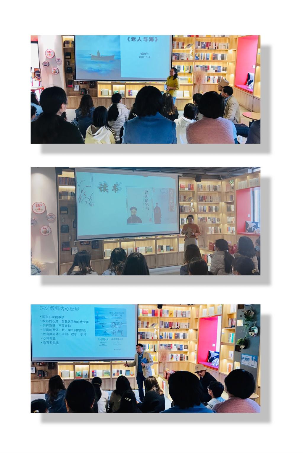随后,数学系张四兰副教授、物理系沈环副教授、化学系石炜副教授三位分享嘉宾,结合工作和生活阅历,围绕自己喜欢书籍分享了阅读感受。其中,张四兰老师说,《老人与海》这本书塑造的那个永不言败、不屈不挠老人告诉我们,勇敢的精神不比英雄的行为逊色,你有多勇敢,就有多强大;沈环老师在分享了《曾国藩的家书》后,与石炜老师不谋而合,针对《教学勇气》这本书,分享了自己教学的心路历程和感悟,他们都认为,这是一本唤醒教学心灵的书,可以让我们重新认识自我,认同自我,完善自我,重拾教学勇气。