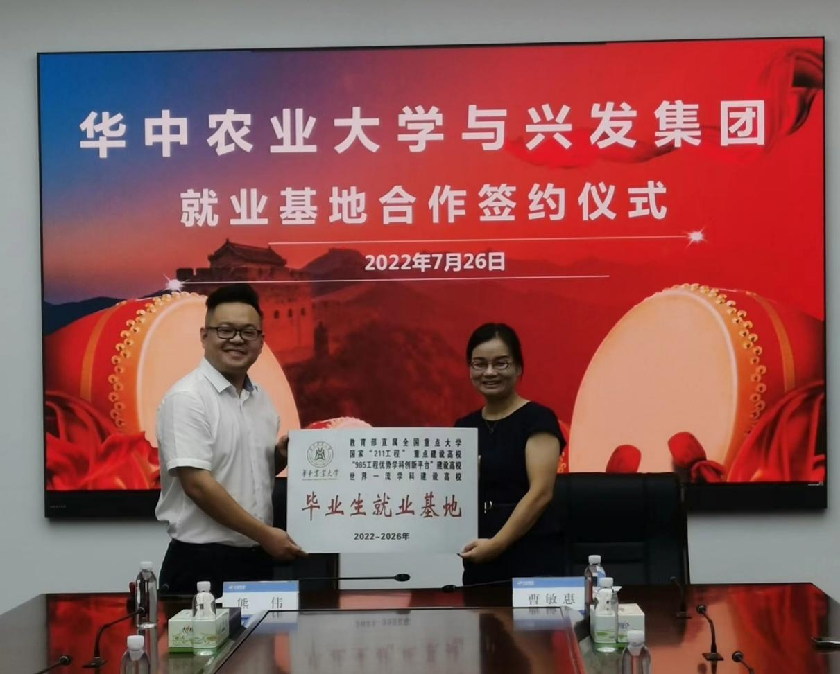 (通讯员:李俊)为进一步拓宽我校应用化学专业毕业生就业渠道,更好的开展校企合作,2022年7月26日下午,理88看球吧 副院长曹敏惠在宜昌与兴发集团人力资源部副部长熊伟共同签署了《华中农业大学学生就业基地协议书》,并举行了就业基地揭牌仪式,正式将兴发集团确定为我校毕业生就业基地。