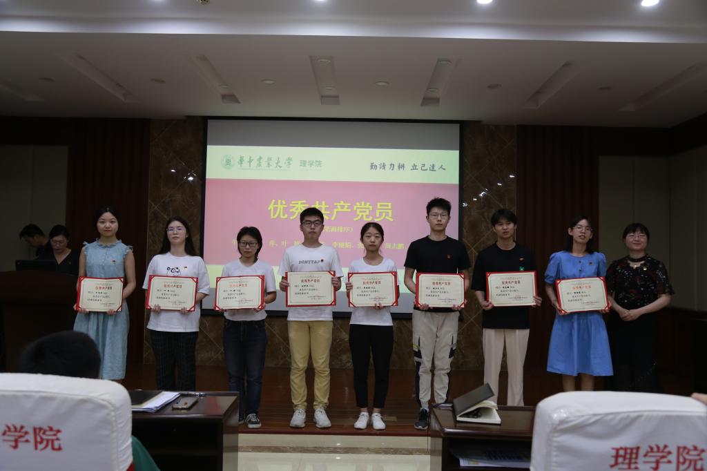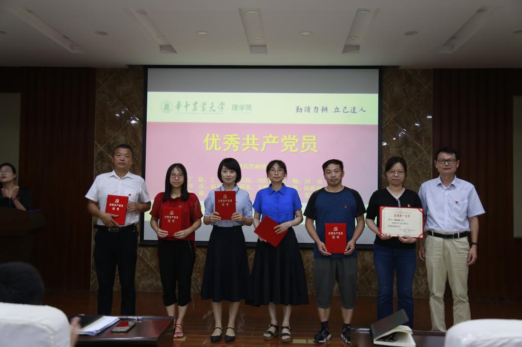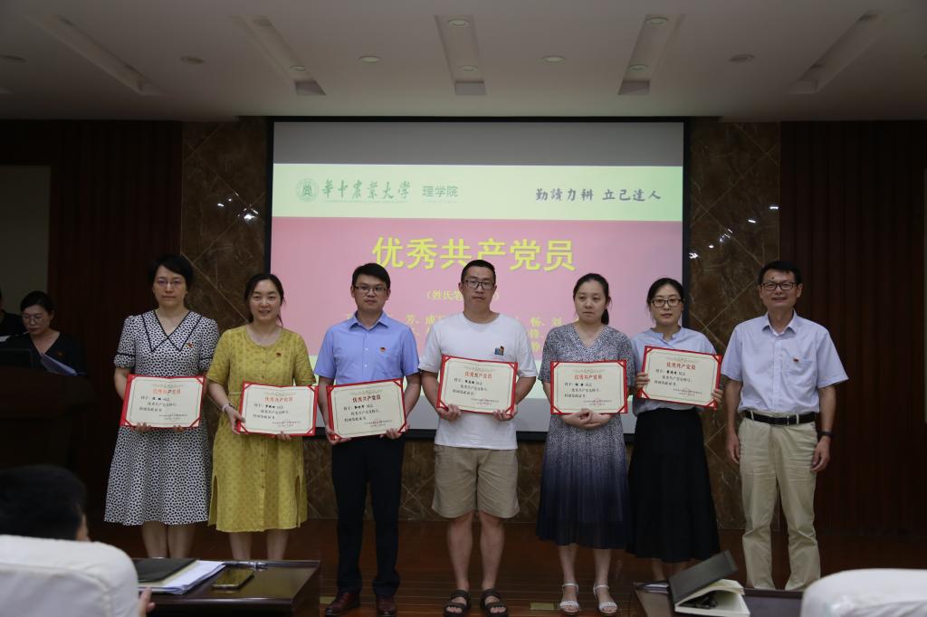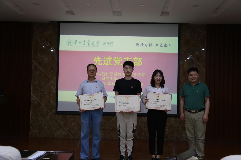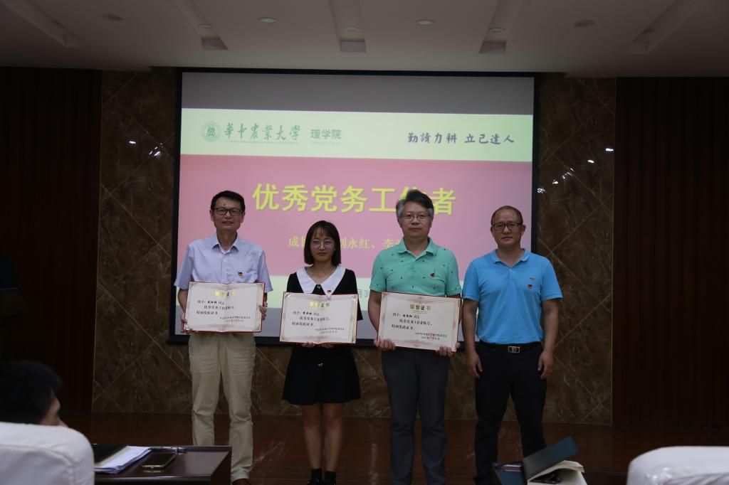 88看球吧 党委副书记祝鑫宣读《关于中共华中农业大学理88看球吧 委员会表彰优秀共产党员、优秀党务工作者和先进党支部的决定》表彰文件,她表示,希望受表彰的先进集体和优秀个人珍惜荣誉、戒骄戒躁、再接再厉,进一步发挥示范引领作用,开拓进取、奋发有为、再立新功。全院各师生党支部和共产党员要向受表彰的“两优一先”学习,全面贯彻新时代党的建设总要求,全面贯彻党的教育方针,坚守信仰、坚持信念、坚定信心,对党忠诚,积极工作,团结带领广大师生不忘初心、牢记使命,抢先机、开新局、创佳绩,推动88看球吧 事业高质量发展。88看球吧 副院长成协设、沈婧芳为丁聪等34名同志颁发“优秀共产党员”荣誉证书,谭佐军院长为成协设等3名同志颁发“优秀党务工作者”荣誉证书,88看球吧 党委书记涂俊才为数学与统计学系教工第二党支部等3个师生党支部颁发“先进党支部”荣誉证书。