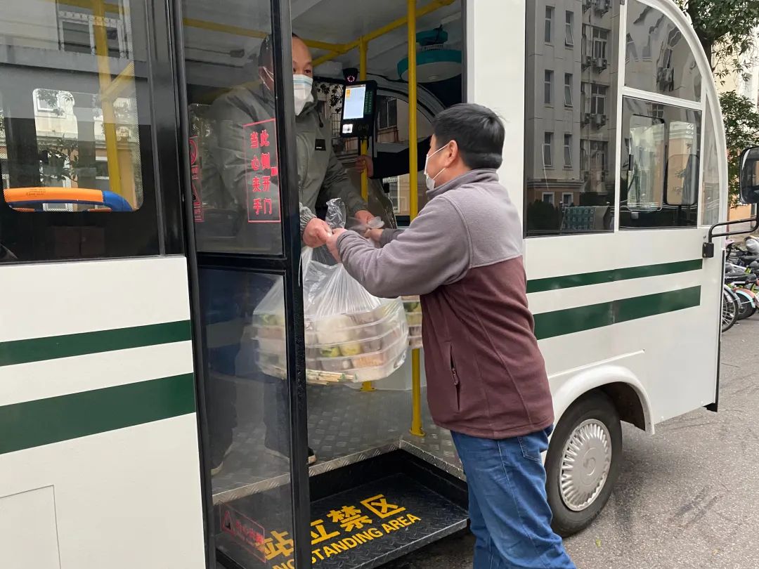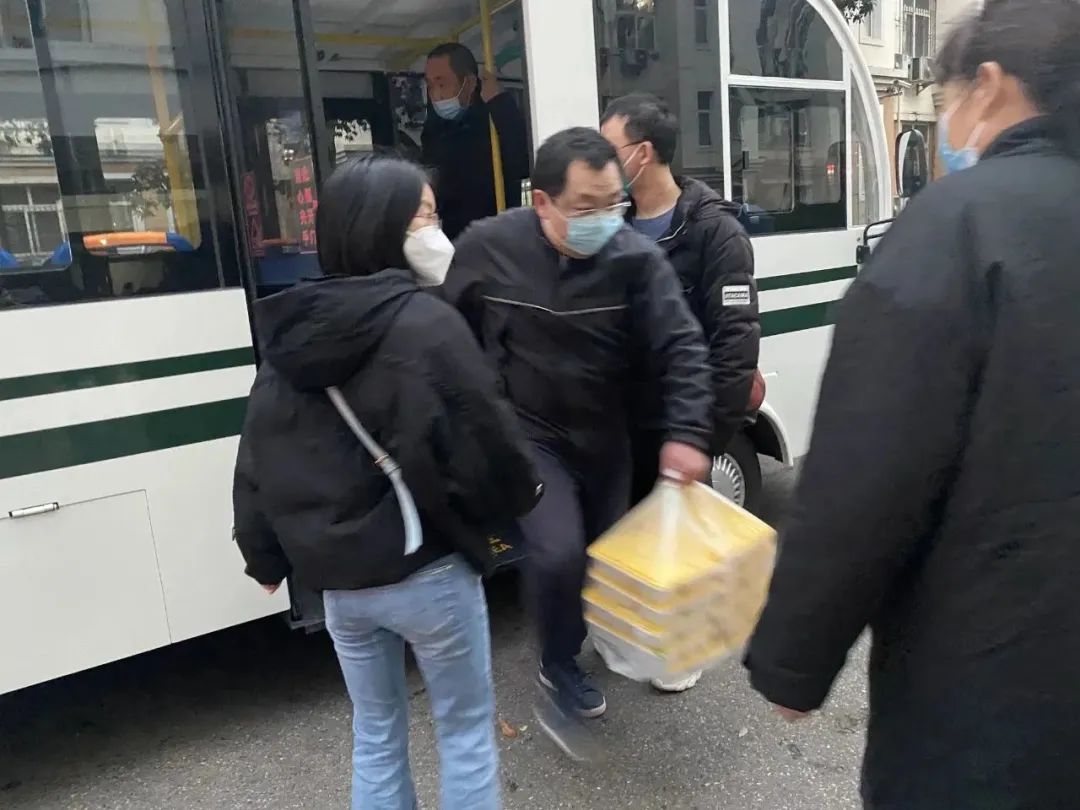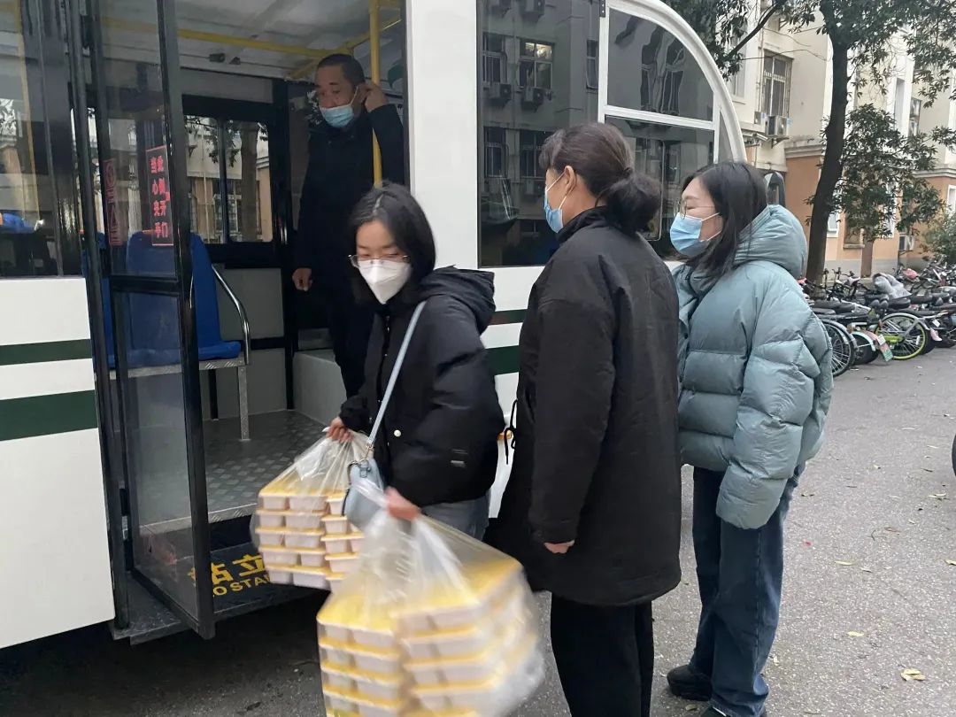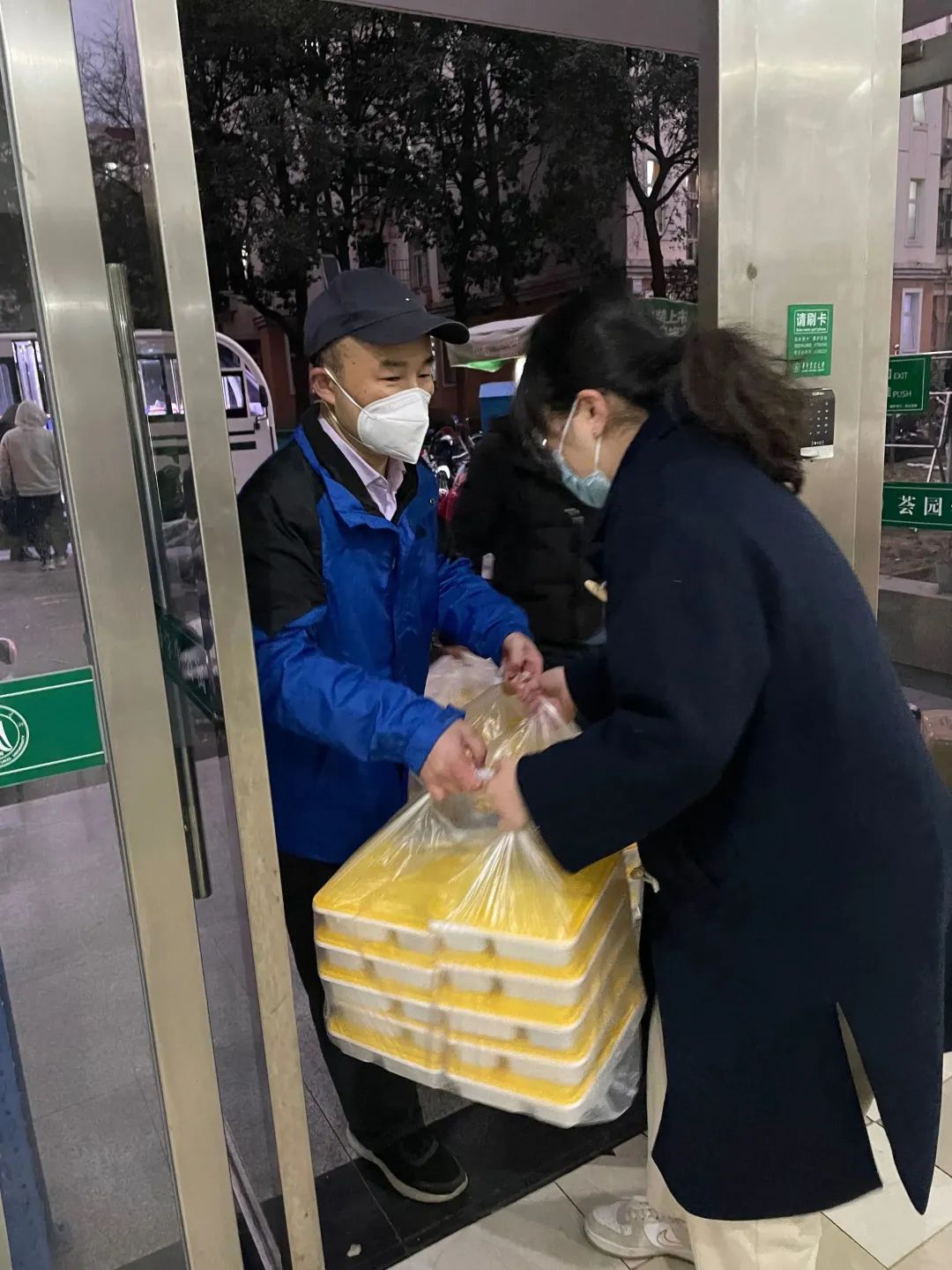 的班主任老师主动在早中晚三餐送餐时间,提前在荟一楼下等候,帮助运送八百多名同学的餐食及生活物资。