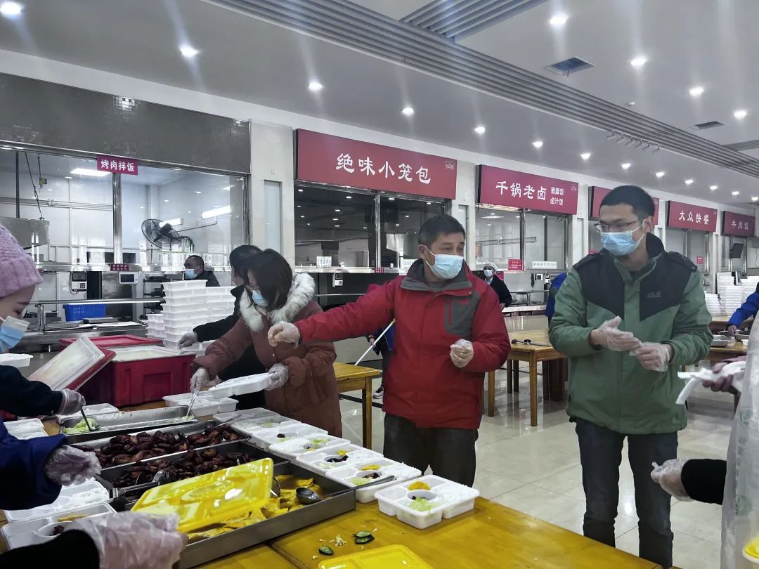 他们齐心协力,共同合作,有的老师在协助将饭菜装盒,有的老师负责饭盒的运输,有的老师负责饭盒的分发。楼栋里还有上下多次楼层的志愿者同学们接应,在一天的三个饭点,同学们能及时吃到可口的饭菜,都是他们在背后默默付出的结果。