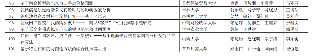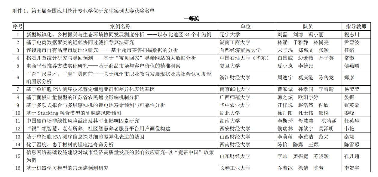 全国应用统计专业学位研究生案例大赛是由全国应用统计专业学位研究生教育指导委员会(MAS)联合全国工业统计学教学研究会、中国统计教育学会高等教育分会共同举办的、面向全国在校统计学硕士研究生的比赛。举办案例大赛的目的在于以赛促学,为培养应用统计专业学位研究生发现问题、研究问题、解决问题和评价问题的能力以适应社会需求;以赛促教,探讨适合我国应用统计硕士的教学方法,提高我国高校统计学教师在应用统计方法与案例教学方面的水平。本次全国应用统计专业学位研究生案例大赛共评选出一等奖16名,二等奖128名,三等奖192名。