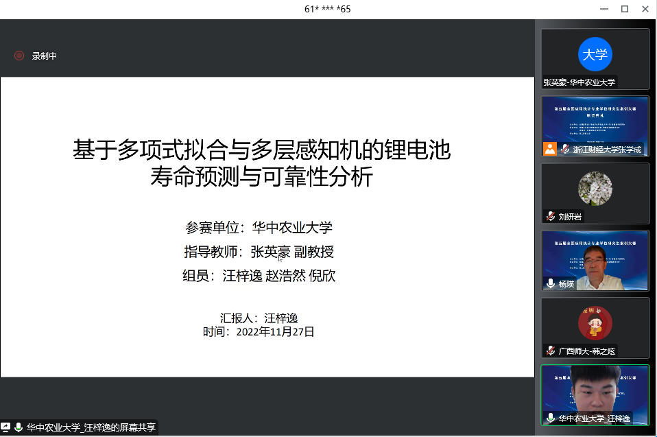 (通讯员:汪梓逸)由全国应用统计专业学位研究生(MAS)教育指导委员会主办,全国工业统计学教学研究会、中国现场统计研究会及中国统计教育学会高等教育分会协办,浙江财经大学承办的第五届全国应用统计专业学位研究生案例大赛颁奖典礼于2022年11月27日线上举行,经全国应用统计专业学位研究生案例大赛评审委员会评审,大会宣布了第五届全国应用统计专业学位研究生案例大赛评奖结果,88看球吧 张英豪副教授带领的硕士研究生汪梓逸、赵浩然、倪欣的案例作品《基于多项式拟合与多层感知机的锂电池寿命预测与可靠性分析》获得了该大赛的一等奖并作了相应作品的大会报告,邹翠明副教授带领的硕士研究生黄倩和王世远的案例作品《基于正交多项式拟合方法的锂电池失效时间预测》获得了大赛的二等奖。