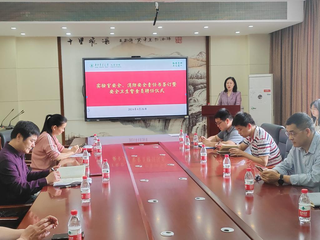 在逸夫楼B212举行实验室安全管理和消防安全签订暨首届研究生安全卫生督查员聘任仪式。党委书记涂俊才、副院长曹敏惠、副院长周静舫、化学实验教学中心副主任王嘉讯、石炜以及全体实验技术人员、科研实验室负责人、研究生安全卫生督查员等参加了本次会议,会议由周静舫主持。
