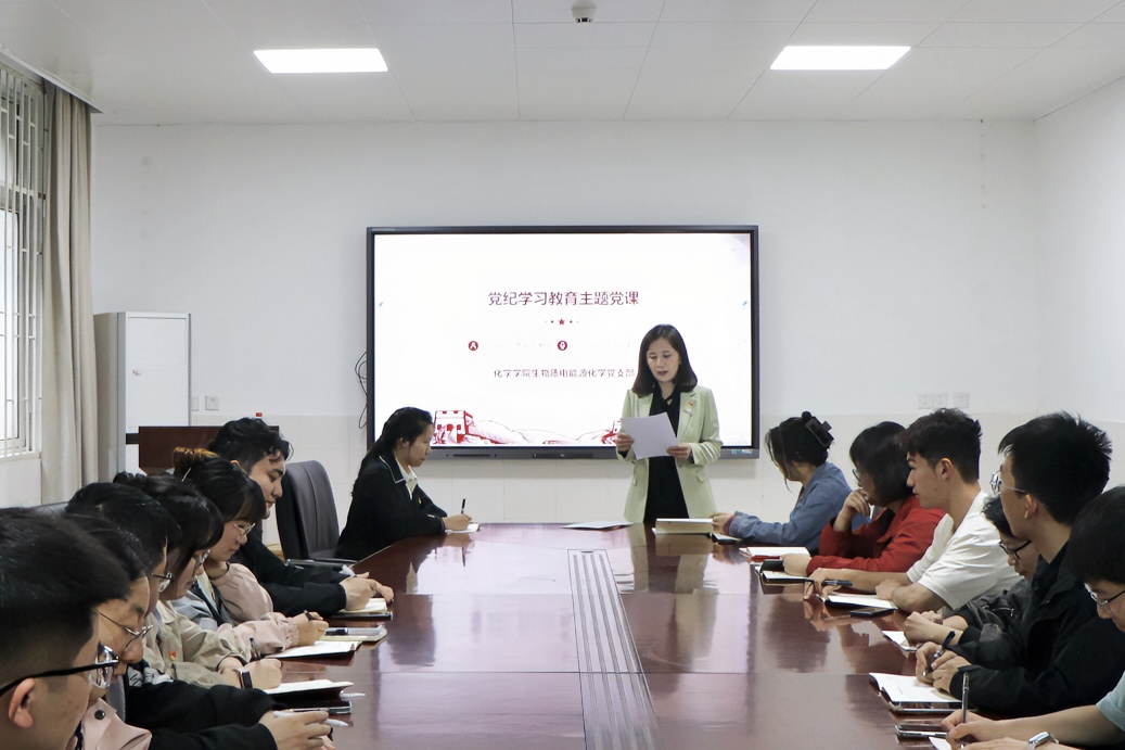 副院长曹菲菲教授在化学楼A106会议室为生物质电能源化学研究生党支部讲授党纪学习教育专题党课。支部全体研究生党员参加活动,活动由党支部书记曹仁达主持。