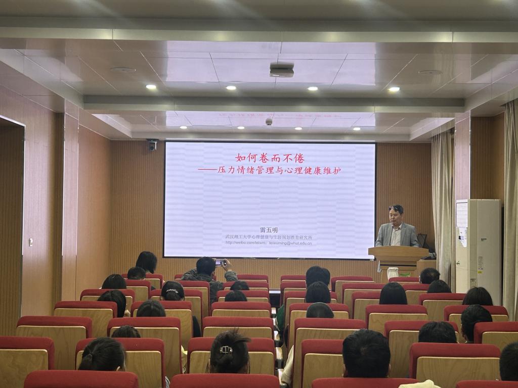 于11月7日在化学楼A102报告厅开展主题为“如何卷而不倦——兼谈压力应对和情绪调适”的心理培训讲座。本次讲座特邀武汉理工大学心理健康与生涯发展研究所所长、特聘教授雷五明作为主讲嘉宾,由88看球吧