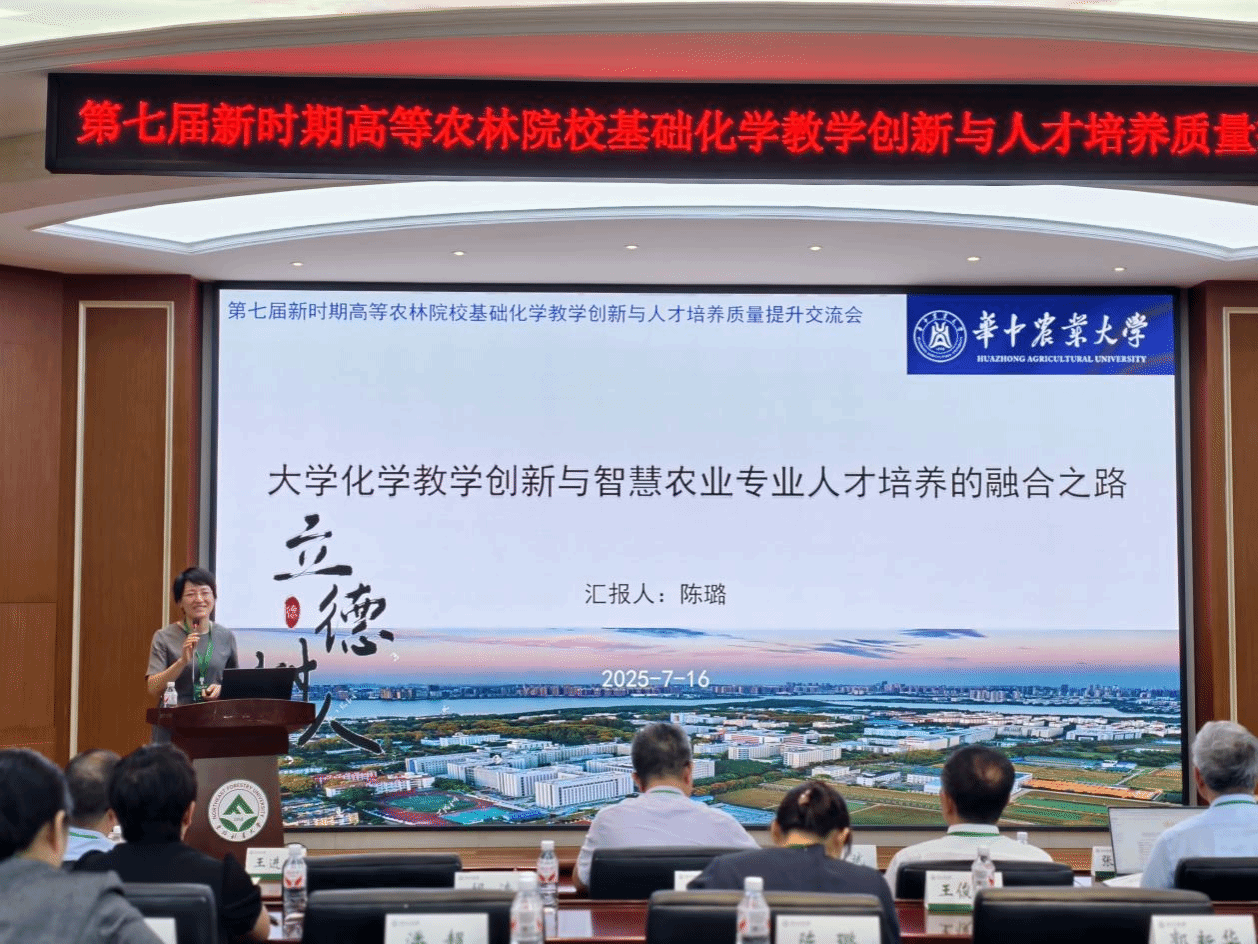 《大学化学》课程负责人陈璐副教授受邀作大会报告,系统展示我校“化学+智慧农业”的融合创新实践。通过重构课程内容、融入“农”味课程思政元素、建设数字化资源,实现化学教学与现代农业需求的无缝对接,为农林高校特色化学教育提供新思路,此报告引发与会专家的热烈反响。