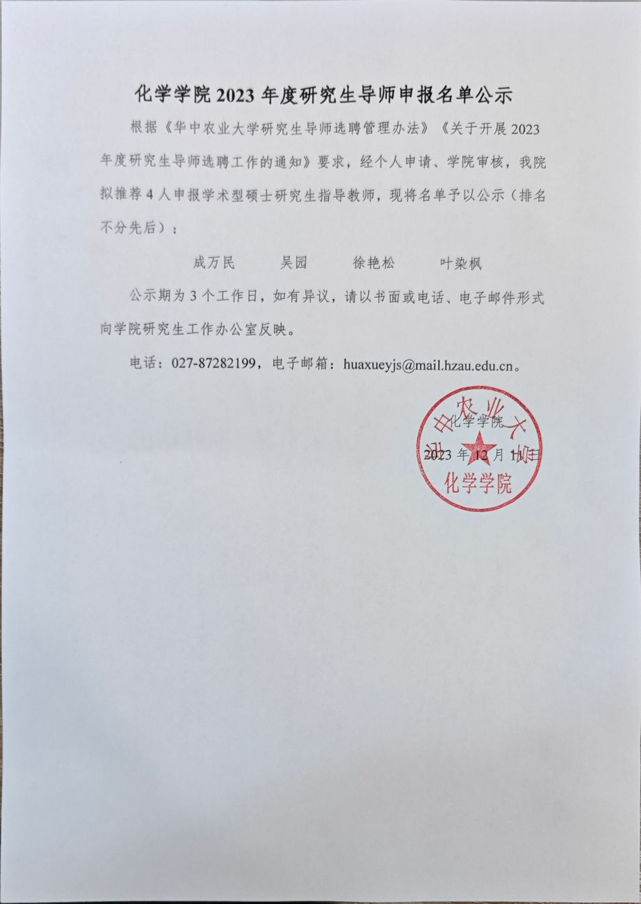 地址:湖北省武汉市洪山区狮子山1号华中农业大学化学楼
