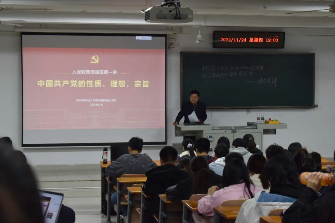 11月24日晚三教B305,中共华中农业大学理88看球吧 委员会分党校开展了入党教育培训班第一次线下党课专题学习,理88看球吧 党委书记涂俊才书记授课,授课主题是关于《中国共产党的性质、理想、宗旨》,理88看球吧 本研入党积极分子参加集中学习。