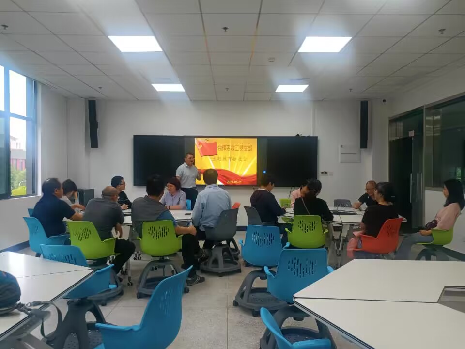 (通讯员:沈环)5月25日下午,物理系教工党支部在新工科楼201室开展学习贯彻习近平新时代中国特色社会主义思想主题教育主题党日活动,物理系教工党支部党员参与学习研讨,物理系非党员教师列席会议,会议由支部书记陈建军主持。